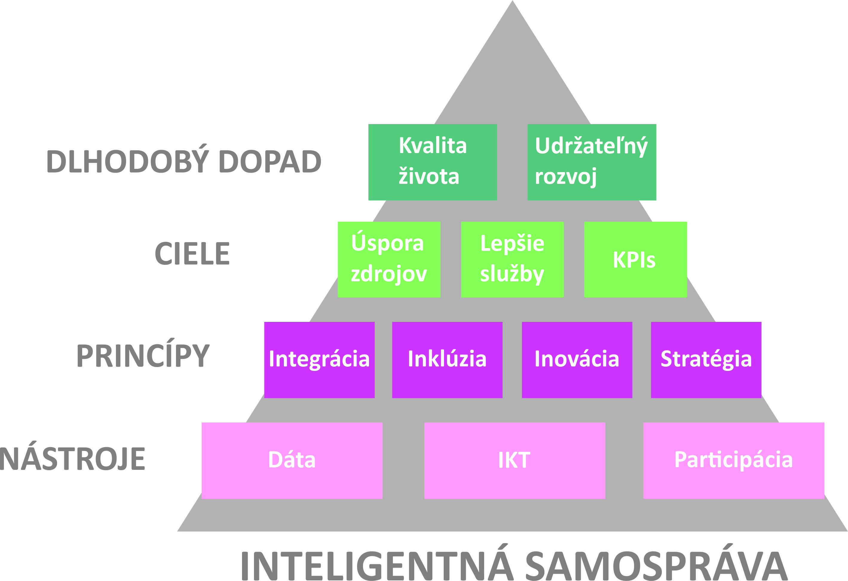 Inteligentné mesto alebo región nie je teda definované ako stav, ktorý možno dosiahnuť, ale ako kontinuálny proces a spôsob nazerania na riešenie výziev, ktorý samospráva využíva pri tvorbe a implementácii rozhodnutí. Jeho cieľom je zabezpečiť, aby sa prostriedky samospráv vynakladali efektívne, so širokým zapojením obyvateľov a na základe identifikovaných potrieb a viedli k všeobecnému zvyšovaniu životnej úrovne v regióne, aj v celej krajine.