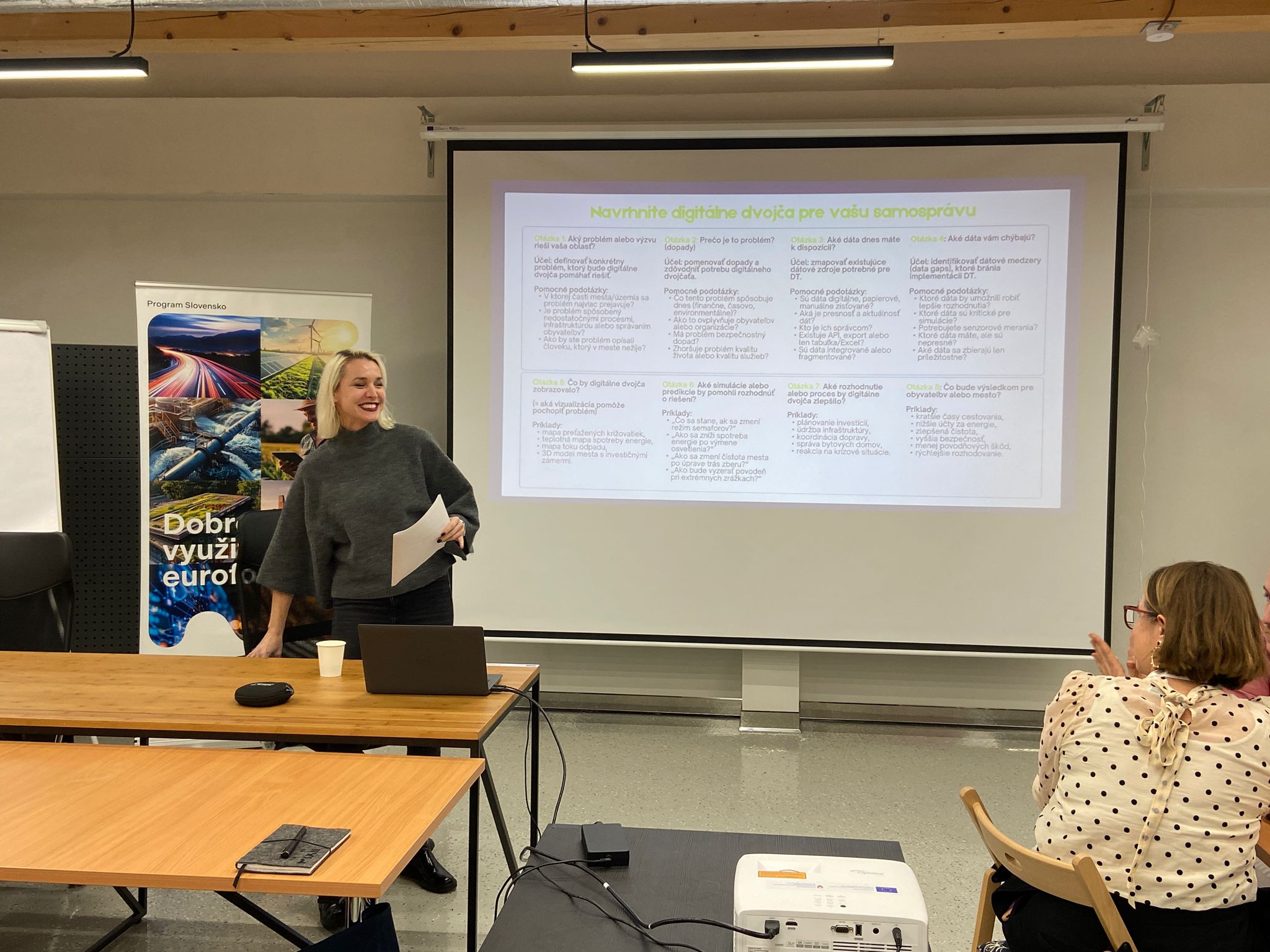 Na záver sme absolvovali spoločný workshop, kde sa účastníci rozdelili do dvoch tematických skupín „Energetika“ a „Doprava“. Výstupom brainstormingu bol jednoduchý návrh digitálneho dvojčaťa pre samosprávu reflektujúci odpovede na osem preddefinovaných otázok.
