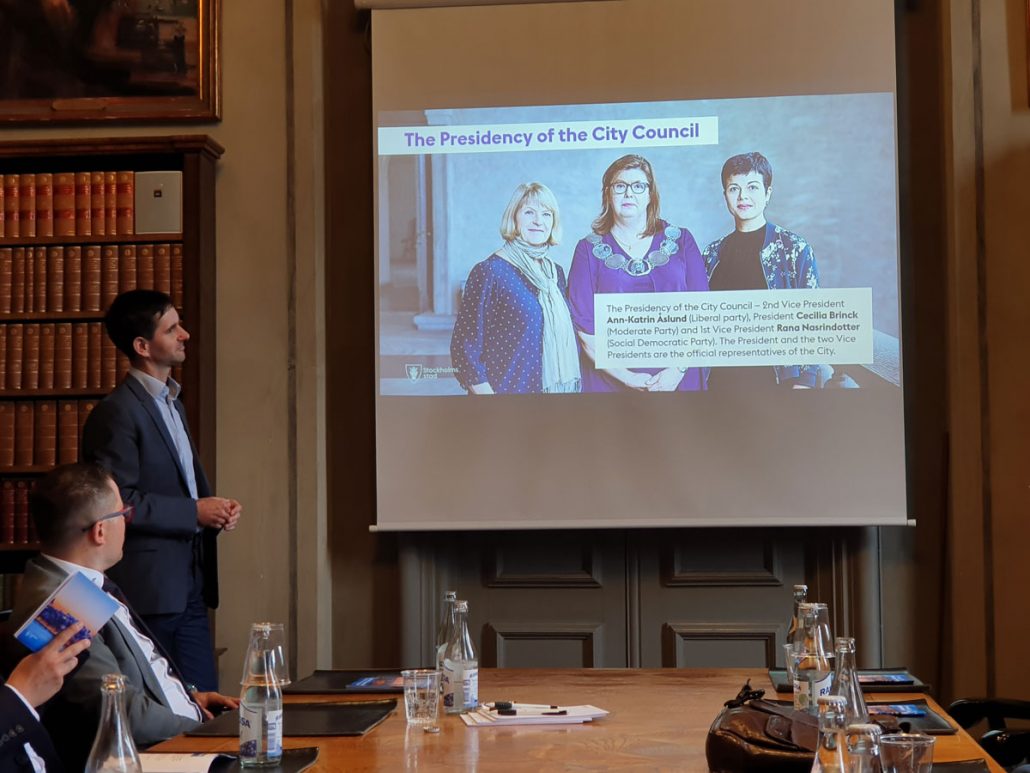 „V Štokholme sa nám dostalo prijatia na najvyššej úrovni. Prezidentka mestského zastupiteľstva mesta Štokholm (najvyššia volená funkcia) – pani Cecilia Brinck – nás nielen prijala, privítala, ale mala pre nás pripravenú prvú prezentáciu. Veľmi ľudsky a zároveň so znalosťou veci nám predstavila fungovanie mesta z hľadiska politického usporiadania, organizačnej štruktúry a prepojenia jednotlivých oddelení a ich kompetencií. Zároveň nám priblížila víziu mesta Štokholm, ktoré chce byť do roku 2040 naj Smart mesto na svete. Bolo inšpiratívne počúvať, ako sa na vážnych a pre mesto dôležitých veciach vedia zhodnúť zástupcovia koalície ako aj opozície a ako je ich fungovanie postavené na vzájomnom rešpekte a spolupráci. Mesto ako také je zároveň veľmi efektívne a v oblastiach, ktoré majú dosah na okolité mestá resp. komúny, úzko spolupracujú aj v rámci regiónu…“